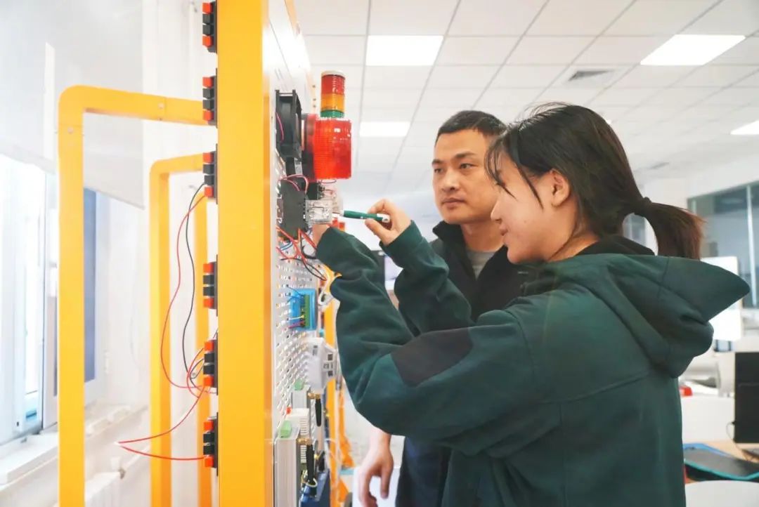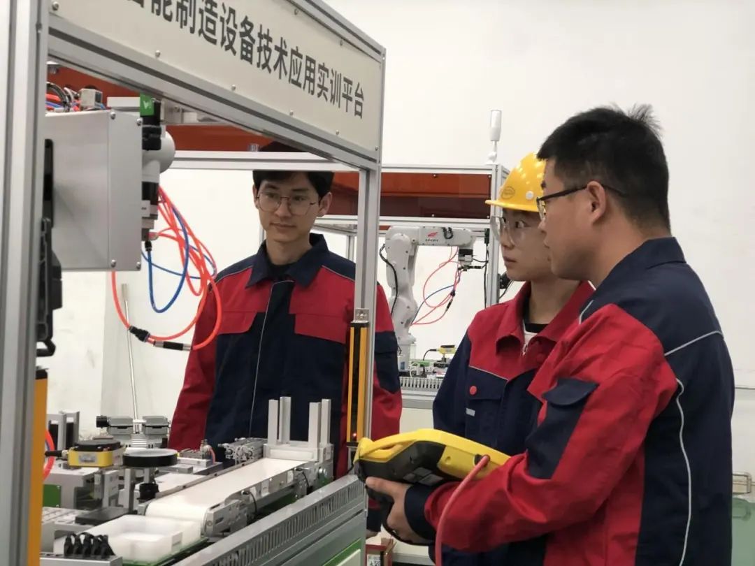 杨鹏翔(左一)与辅导老师(右一)在对学生进行智能制造设备技术应用实训进行讲解。