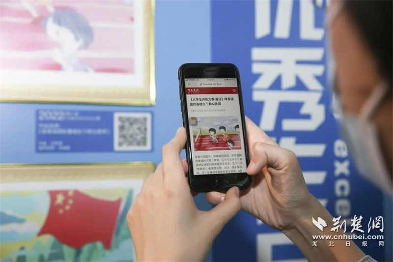 嘉宾在场外扫码观看大赛优秀音视评、漫评作品。记者 刘建维 摄