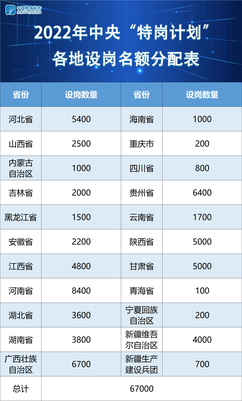(二)招聘数量。2022年计划招聘中央“特岗计划”教师67000名,相关省(区、市)和新疆生产建设兵团的招聘计划名额见《2022年中央“特岗计划”各地设岗名额分配表》(附件)。