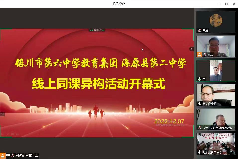 2022年7月22日,银川市教育局与中卫市教育局签署《教育战略合作框架协议》,启动实施区域教育发展促进、教师队伍培养帮扶、“互联网+质量监测”3项行动计划,通过教育教学管理、名师结对帮扶、教师跟岗培训、教育资源共享等方面深层次的交流与合作,共同推动两地教育事业高质量发展。之后,银川市第六中学教育集团和中卫市海原县第二中学结为“手拉手”互助学校。在疫情防控的特殊时期,学校一边积极推进线上教学,另一方面积极谋划推进互促、共享的合作交流。