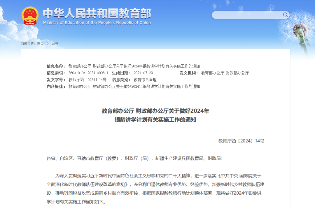 近日,教育部、财政部联合印发《关于做好2024年银龄讲学计划有关实施工作的通知》(点击左下角“阅读原文”查看文件全文),根据国家银龄教师行动计划整体部署,今年计划招募7000名银龄讲学教师(宁夏35名),发挥优秀退休教师引领示范作用,支持农村地区教育发展。一起来看——