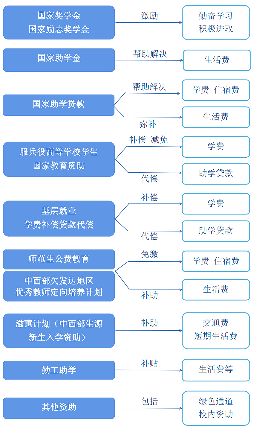 北京师范大学、华东师范大学、东北师范大学、华中师范大学、陕西师范大学和西南大学六所教育部直属师范大学的公费师范生,以及中西部欠发达地区优秀教师定向培养计划(简称“优师计划”)师范生,在校期间不缴纳学费、住宿费,还可获得生活费补助。有志从教并符合条件的非师范专业优秀学生,在入学两年内,可按规定转入师范专业,高校返还学费、住宿费,补发生活费补助。学生在校延长修读年限期间,所有费用自理。