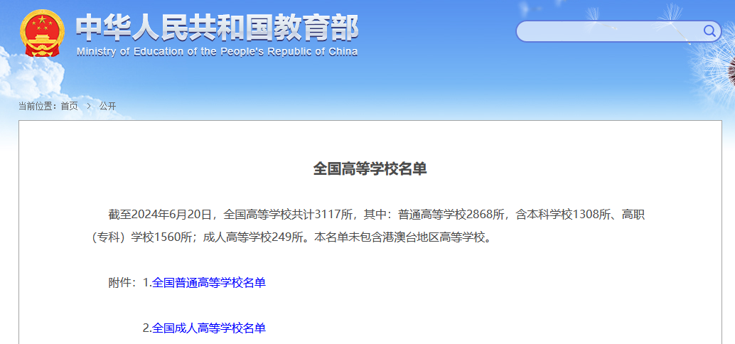 6月21日,教育部发布全国高等学校名单。截至2024年6月20日,全国高等学校共计3117所(未包含港澳台地区高等学校),其中,全国普通高等学校共计2868所,含本科学校1308所、高职(专科)学校1560所;成人高等学校249所。其中,宁夏共有普通高等学校22所,成人高等学校1所。