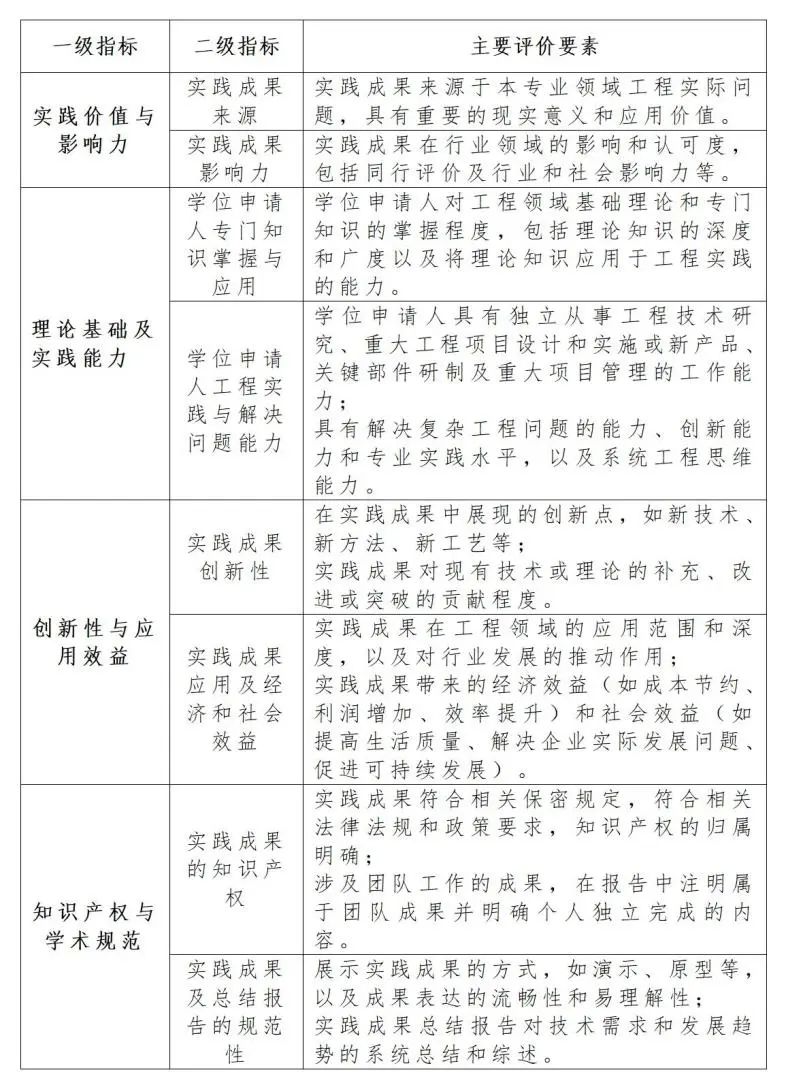 实践成果应在实践中产生新专利、新产品、新作品、新方法、新工艺、新材料、新设备、新技术、新标准等,对推动工程实践作出重要贡献。具体包括但不限于以下方面:发明了新技术,提出了新方法,解决了相关工程领域关键技术难题,实现产业领域技术或产品工程创新;提出了新工程方案设计、新制造工艺,解决了重大工程项目的关键技术难题,取得突出的实施效果,具有推广应用价值;提出了新的工程应用方案、新产品制造工艺、新研发技术,解决了工程应用、产品研发过程中的关键技术难题,具有较高的推广应用价值;其他解决重要实际工程技术问题并取得较大成效的创新性成果。