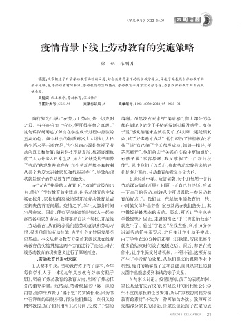 摘要:文章概述了目前劳动教育面临的问题,结合疫情背景下的线上教学特点,阐述了开展线上劳动教育的
