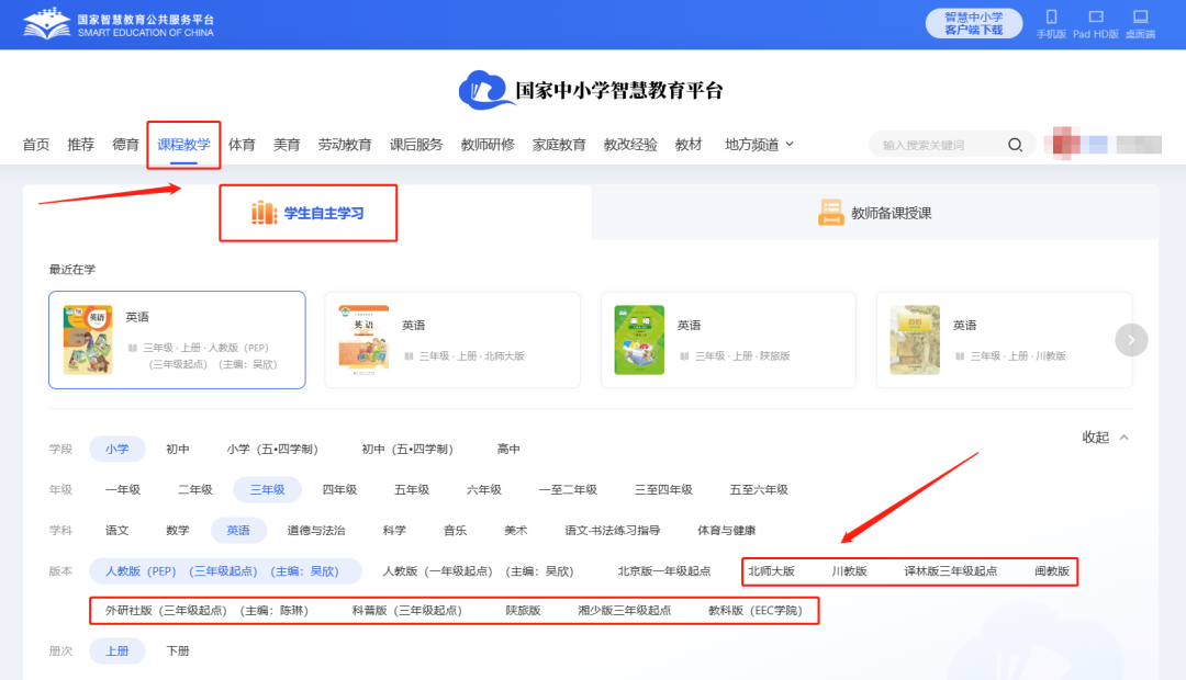 其中,小学英语新上资源涉及多个版本,用户通过平台【课程教学】-【学生自主学习】,选择对应学段、年级、学科、版本、册次,就可以查看相应资源。