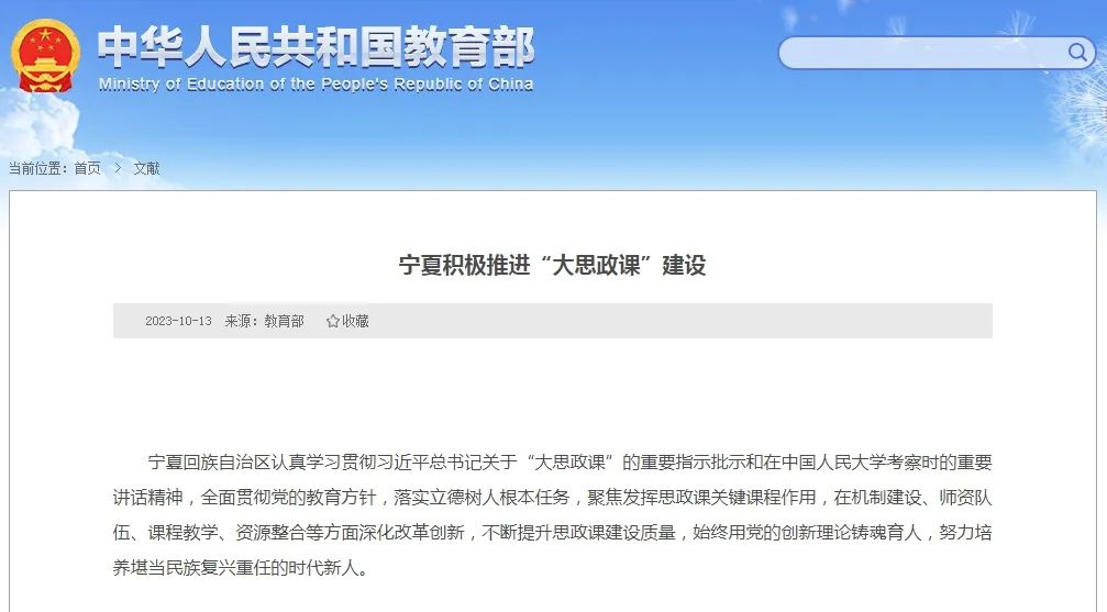 近日,教育部官方网站发布文章《宁夏积极推进“大思政课”建设》,为宁夏思政课建设取得的喜人成绩点赞!