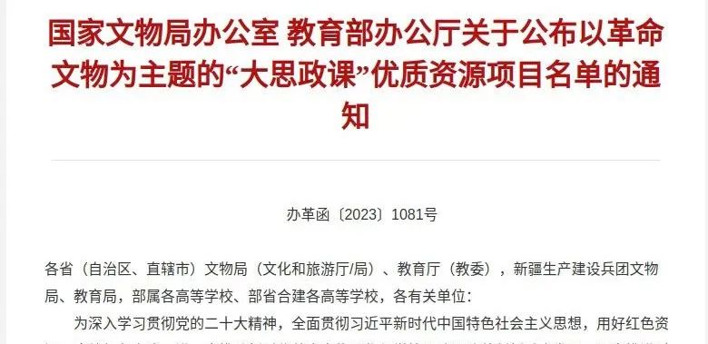 近日,国家文物局、教育部公布以革命文物为主题的“大思政课”优质资源项目名单,我区1个精品项目入选。