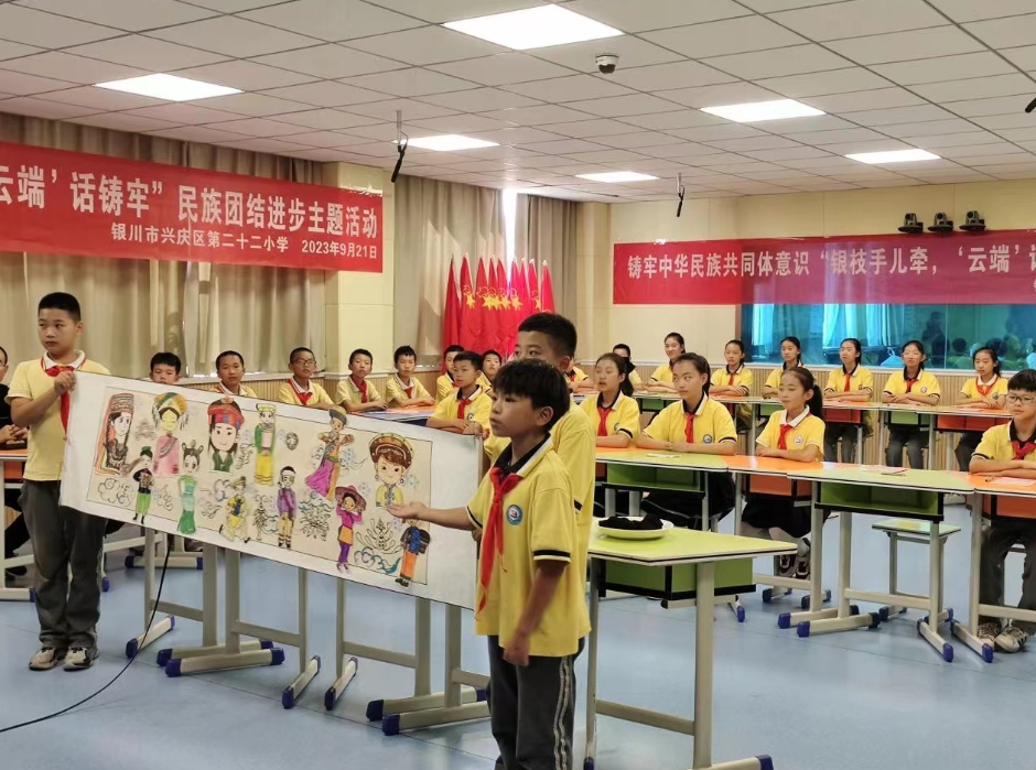 银川市兴庆区第二十二小学与湖北省枝江市团结路小学开展“银枝手儿牵 云端话铸牢”民族团结进步主题活动。