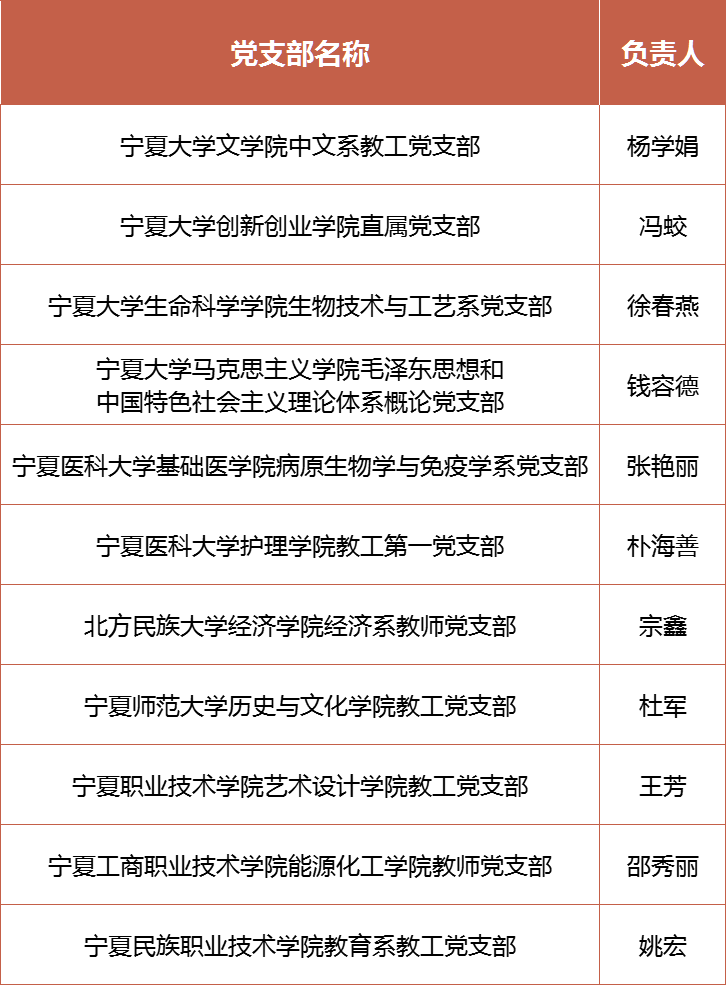 近日,教育部公布全国高校“双带头人”教师党支部书记“强国行”专项行动团队名单,宁夏11个团队榜上有名。一起来看↓↓↓